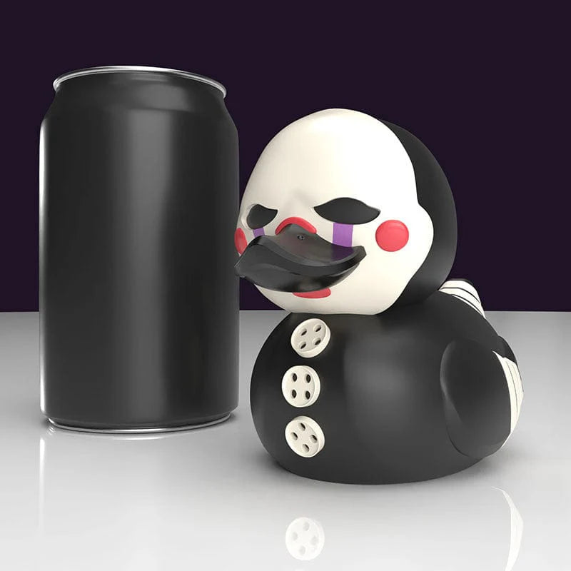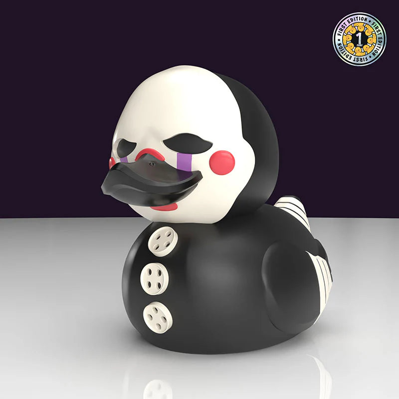 Non lasciatevi ingannare dal silenzio! Five Nights at Freddy's Marionette TUBBZ è scivolato fuori dalla scatola dei premi ed è finito nello stagno! Ora infesta la serie TUBBZ come un'anatra cosplay, questo pupazzo non ha bisogno di particolari fronzoli in fatto di stile. Con la sua maschera spettrale, gli arti a strisce e le sue inconfondibili lacrime, questo inquietante intrattenitore è qui per aggiungere un tocco di paura alla vostra collezione.
